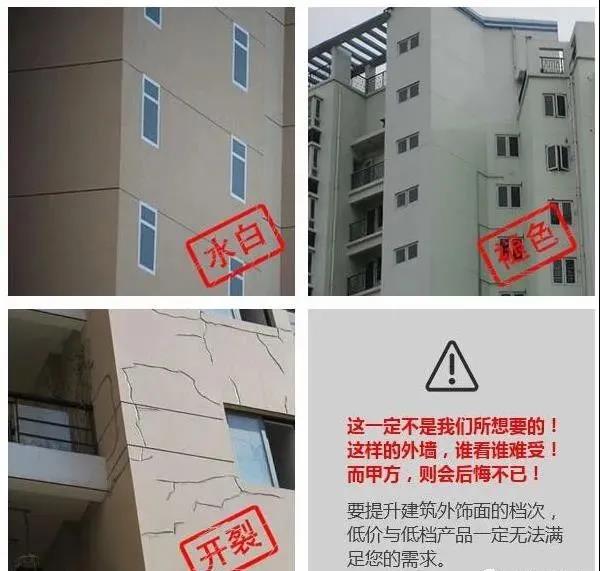 苯丙乳液,眾所周知,長時間泡水,苯丙乳液是百分之百發(fā)白的,夏天或許浸泡時間會長一些。純丙或硅丙,作用比苯丙好。但當氣溫過低而施工又未干透時遇到寒冬加雨水夾攻,再好的配方真石漆也相同面對發(fā)白風險。試驗標明:在4℃以下的冰冷溫度下,選用較好的硅丙乳液做相同試驗,結果真石漆仍是發(fā)白。所以環(huán)境、氣候是真石漆發(fā)白的重要因素。