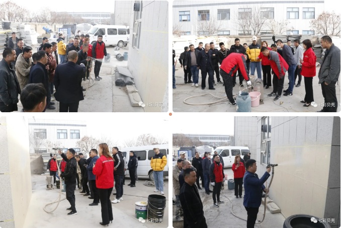 培訓(xùn)現(xiàn)場(chǎng),七彩貝殼集團(tuán)以集團(tuán)的SG-6人工智能?chē)娡繖C(jī)、SG-9大流量砂漿噴涂機(jī)為例,向現(xiàn)場(chǎng)的工人進(jìn)行了真石漆、保溫顆粒的噴涂演示,并就機(jī)器的基本操作問(wèn)題進(jìn)行了詳細(xì)的講解,現(xiàn)場(chǎng)的工人紛紛進(jìn)行現(xiàn)場(chǎng)操作,并對(duì)機(jī)器的噴涂效率、機(jī)器的智能化水平給予了充分肯定。